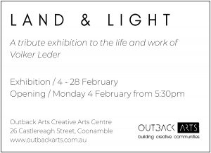 The Land and light exhibition is a 4-week tribute to the life of Volker Leder. Opening night is Monday 4th Februray 2019 @ 5pm. Come along and immerse yourself into the wondrous work and life of Volker Leder.