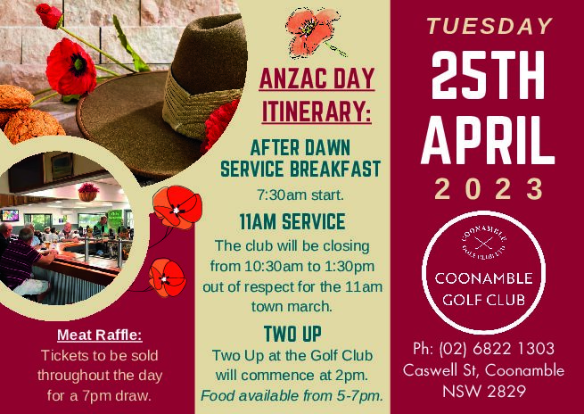 April 25, 2023 @ 12:00 am ANZAC Brekkie & Two-up Coonamble Golf Club Caswell Street, Coonamble, New South Wales, Australia