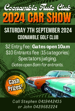 September 7, 2024 @ 10:00 am Coonamble Annual Car Show Coonamble Golf Club Caswell Street, Coonamble, New South Wales, Australia