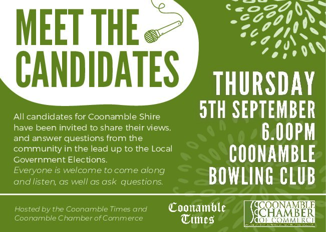 September 5, 2024 @ 6:00 pm Meet the Candidates Coonamble Bowling Club Aberford Street, Coonamble, New South Wales, Australia