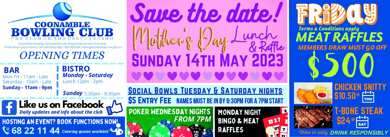 May 14, 2023 Mothers Day Lunch and Raffle Coonamble Bowling Club Aberford Street, Coonamble, New South Wales, Australia