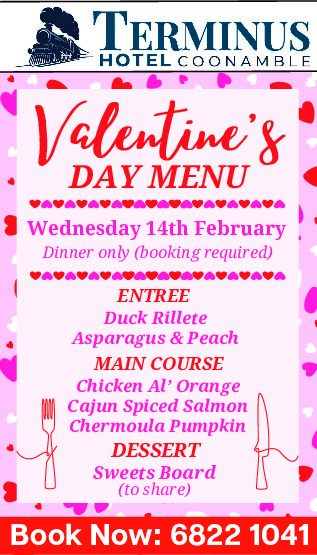 February 14, 2024 Valentines Dinner Terminus Hotel Coonamble 25/27 Railway St, Coonamble, NSW, Australia
